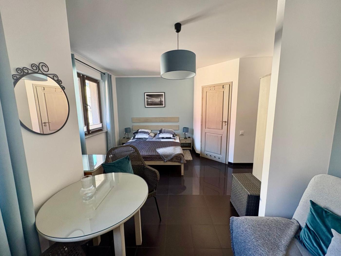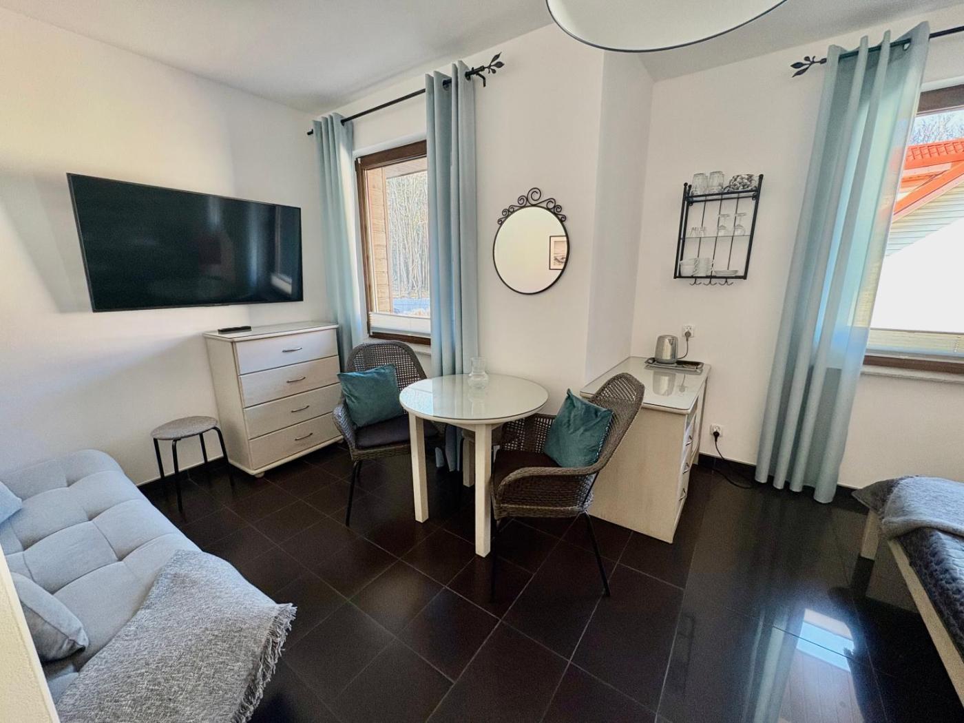Studio z łóżkiem typu king-size i rozkładaną sofą. The studios kitchen, which features a refrigerator and kitchenware, is available for cooking and storing food. The studio offers a tea and coffee maker, a dining area, as well as a private bathroom featuring a walk-in shower and a hairdryer. The unit offers 2 beds. Studio - 4 osobowy. Powierzchnia pokoju ok.: 27 mkw.